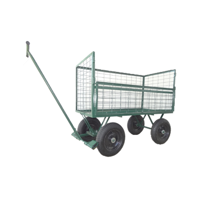 Carro/ Carrinho caixa, fabricado em assoalho de chapa. Todo seu contorno é feito em tela. Possui meia porta lateral com trinco Possui sistema 5ª roda, dotado de cabo de tração em forma da “T” com articulação. Capacidade para 800 Kg. Equipado com 4 maciças de 300” x 8”, sendo 2 montadas no eixo e 2 com freio montadas na “5ª roda”. Possui 120 cm de comprimento, 60 cm de largura e 70 cm de altura da plataforma à tela. O cabo possui 100 cm de altura.