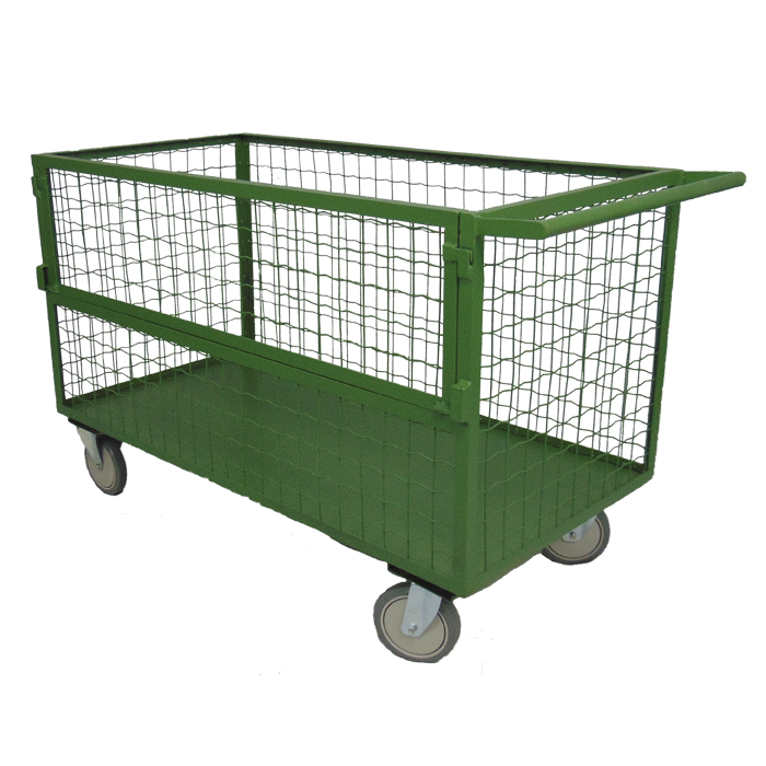 Carro/Carrinho caixa, fabricado em assoalho de chapa. Todo seu contorno é feito em tela. Possui meia porta lateral com trinco e puxador tubular. Capacidade para 400 Kg. Equipado com 4 rodízios de composto termoplástico com rolamento de esfera de 6”, sendo 2 fixos e 2 giratórios. Possui 120 cm de comprimento, 60 cm de largura e aba de 60 cm de altura.