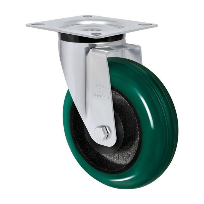 Produzidas com revestimento em poliuretano moldado cor verde de alta dureza e núcleo em ferro fundido cinzento. O perfil arredondado da face rodante proporciona redução da área de contato com o piso, facilidade para movimentação e manobras, diminuindo o esforço de manuseio e o nível de ruído no deslocamento. Proporcionam durabilidade superior por ter maior camada de poliuretano do que as rodas convencionais. Possuem excelente resistência a abrasão, a impactos, a intempéries e a produtos químicos como graxas, óleos, sais e solventes. A velocidade de trabalho indicada é até 4km/h.