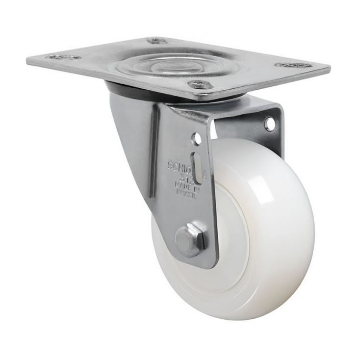 Produzidas com revestimento e núcleo em nylon poliamida 6.0 de alta qualidade. São leves e possuem ótima resistência mecânica, rodam com muita facilidade exigindo menor esforço para manobras e movimentação. Ideais para aplicações em ambientes úmidos, são resistente as graxas, óleos, sais e alguns tipos de ácidos. Fabricadas com material reciclável. A velocidade de trabalho indicada é até 4 km/h.